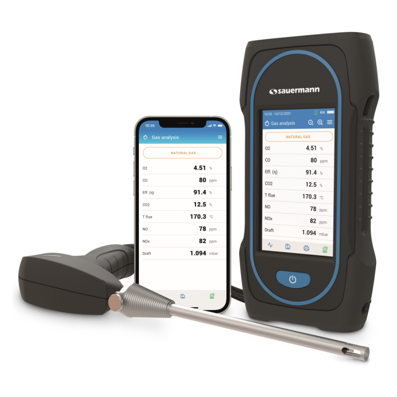 Analyseur de combustion Si-CA 130 Kit 2AS avec écran tactile, 2 cellules électrochimiques (O2, CO) évolutif jusqu'à 3 cellules (NO), protection des cellules par arrêt de la pompe, sonde de prélèvement 180 mm avec tuyau de 2 m et pot à condensat avec filtre, coque de protection aimantée, sacoche de transport, chargeur d'alimentation, câble USB, guide de démarrage rapide et certificat détalonnage. Communication sans fil pour application mobile et imprimante déportée (en option). Garantie 2 ans.