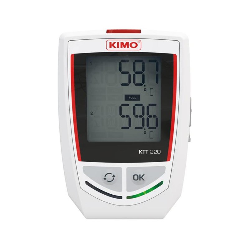 Enregistreur de Température type KTT-220-O avec 2 entrées pour Thermocouple type K (-200 à 1300°C), J (-100 à 750°C), T (-200 à 400°C), N (-200 à +1300°C) et S (0 à 1760°C), avec afficheur 2 lignes, boîtier IP 54 avec fixation magnétique. Capacité mémoire 1 000 000 de points
