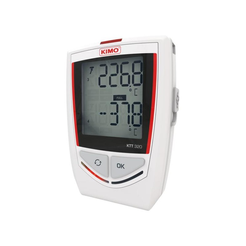 Enregistreur de Température type KTT-320 avec 4 entrées pour Thermocouple type K (-200 à 1300°C), J (-100 à 750°C), T (-200 à 400°C), N (-200 à +1300°C) et S (0 à 1760°C), avec afficheur 2 lignes, boîtier IP 54 avec fixation magnétique et support mural antivol. Communication Bluetooth pour application mobile et tablette (androïd et Ios) et capacité mémoire 2 000 000 de points