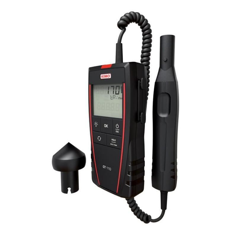 Tachymètre portable type CT 110 avec sonde optique et embout de contact, câble longueur 2 m, (60 à 60 000 tr/min et 4 à 2500 m/min). Afficheur 2 lignes. Fonctions : Hold, Min, Max, rétro-éclairage et auto-extinction. Livré avec 1 m de ruban réfléchissant, sacoche de transport et certificat d'étalonnage.