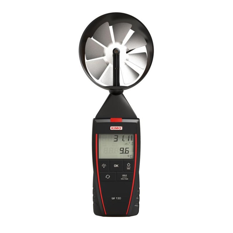Thermo-Anémomètre à hélice Ø 100 mm portable avec sonde à hélice Ø 100 mm intégrée, (0,3 à 35 m/s et 0 à +50°C). Afficheur 2 lignes. Fonctions : Vitesse, débit, débit aux cônes (K25, K85 uniquement ), Température, moyenne automatique, détection du sens du flux d'air, Hold, Min, Max, rétro-éclairage, changement d'unité et auto-extinction réglable. Livré avec sacoche de transport et certificat d'ajustage.